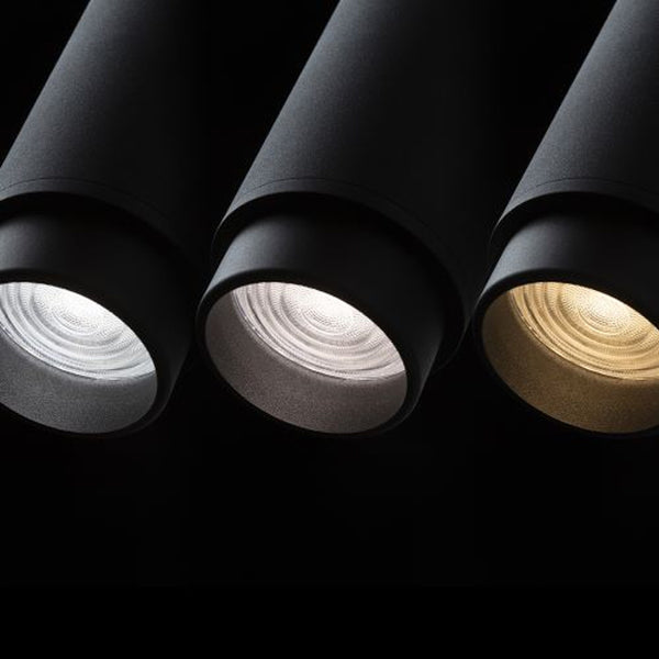 Foco cilíndrico minimalista con casquillo GU10 para carriles trifásicos. Los resortes del casquillo permiten el uso de fuentes de luz de varias longitudes.