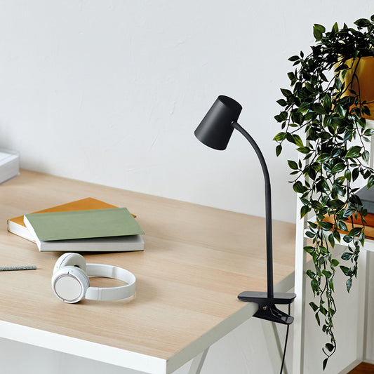 Lámpara de pinza con pantalla cónica, LED incorporado, brazo de cuello de cisne y regulador de intensidad situado en la pinza. La longitud máxima de la pinza es de 2,5 cm y dispone de tres niveles de atenuación.