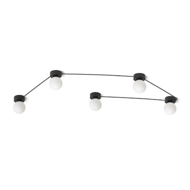 Plafones o apliques con pantallas de cristal sobre base lacadas en negro, conectados en fila por cables negros. Las luminarias se pueden agrupar según su imaginación. Adecuados para fuentes de luz LED con base G9.