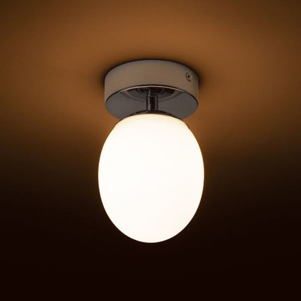 Lámpara de techo en combinación de cristal interior opalino y cristal exterior transparente sobre base cromada para bombillas LED con casquillo E27. Apta para ambientes húmedos.