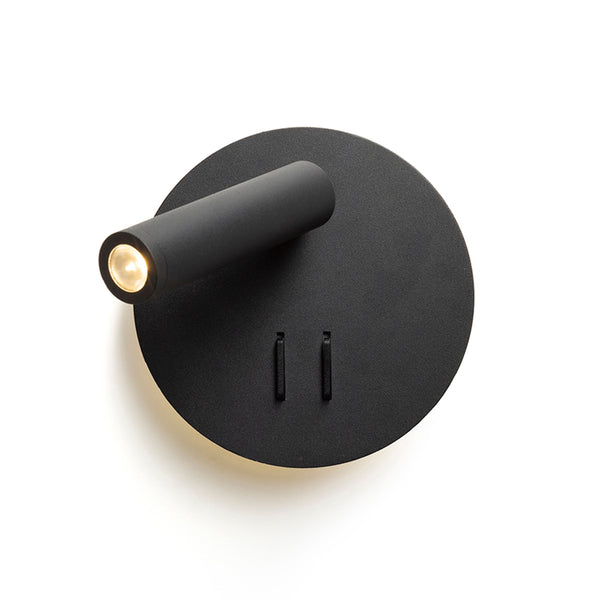 Lámpara LED de pared con foco orientable e iluminación indirecta hacia arriba y hacia abajo. Tanto la iluminación puntual como la indirecta se controlan mediante interruptores independientes en la base.