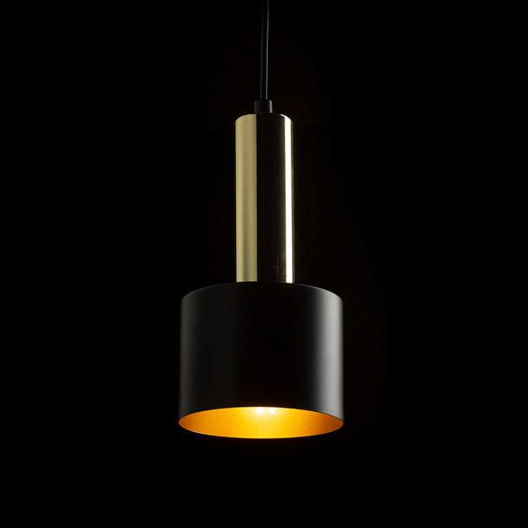 Foco colgante cilíndrico minimalista para fuentes de luz GU10 sobre base redonda. Los resortes del casquillo permiten el uso de fuentes de luz de varias longitudes.