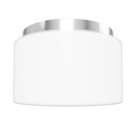 Cilindro de techo de cristal opalino sobre base cromada, apto para ambientes húmedos.