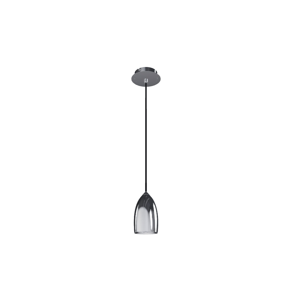 Lámpara colgante con pantalla y base de techo de cromo o níquel mate. Incluye un cable textil negro.