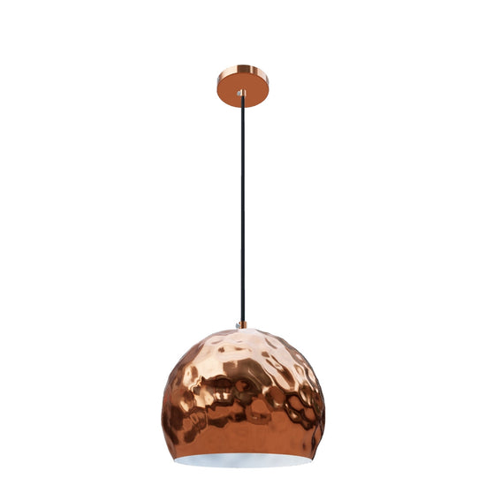 Lámpara colgante con pantalla metálica abollada. El exterior de la pantalla es de color cobre y el interior está lacado en blanco. Incluye un cable de PVC negro y una base de techo de color cobre que combina con la lámpara.