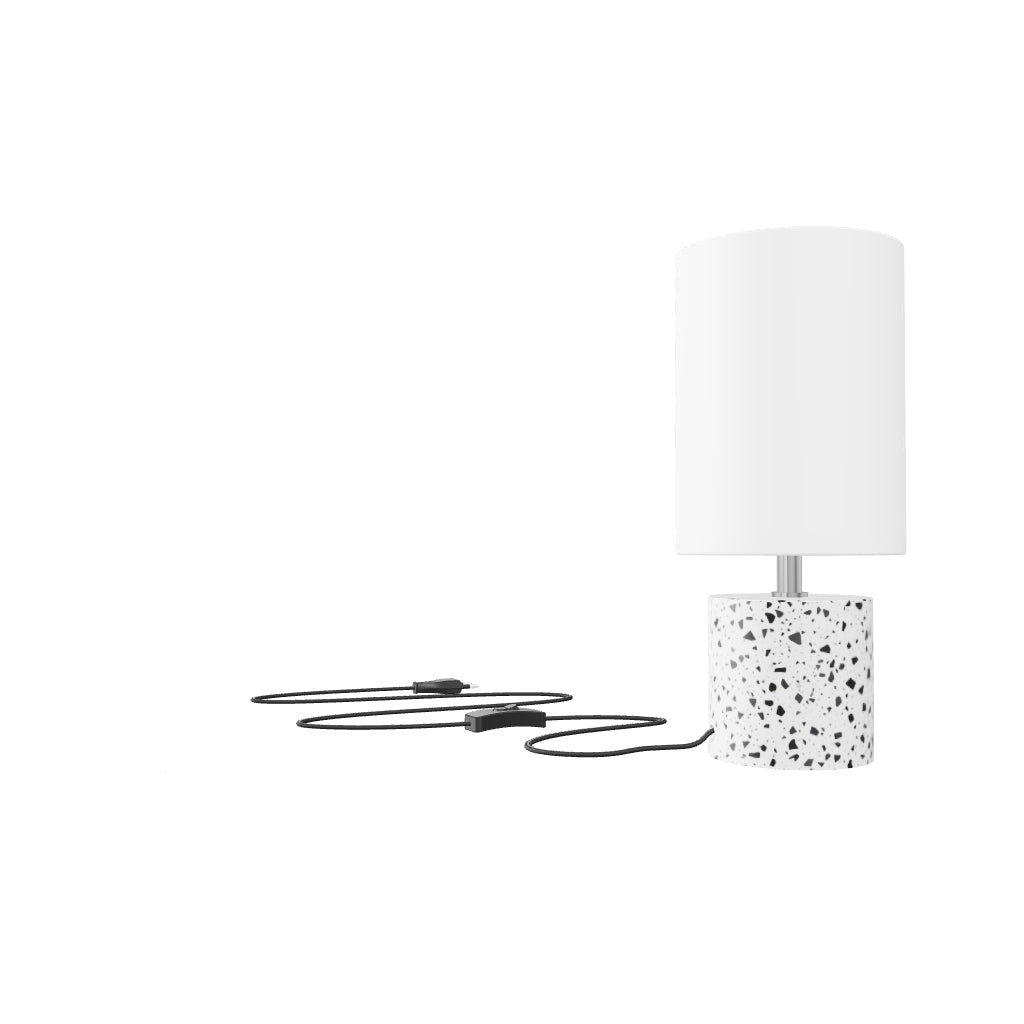 Lámpara de mesa minimalista de forma cilíndrica que incluye una pantalla textil. Cada base tiene un patrón único.