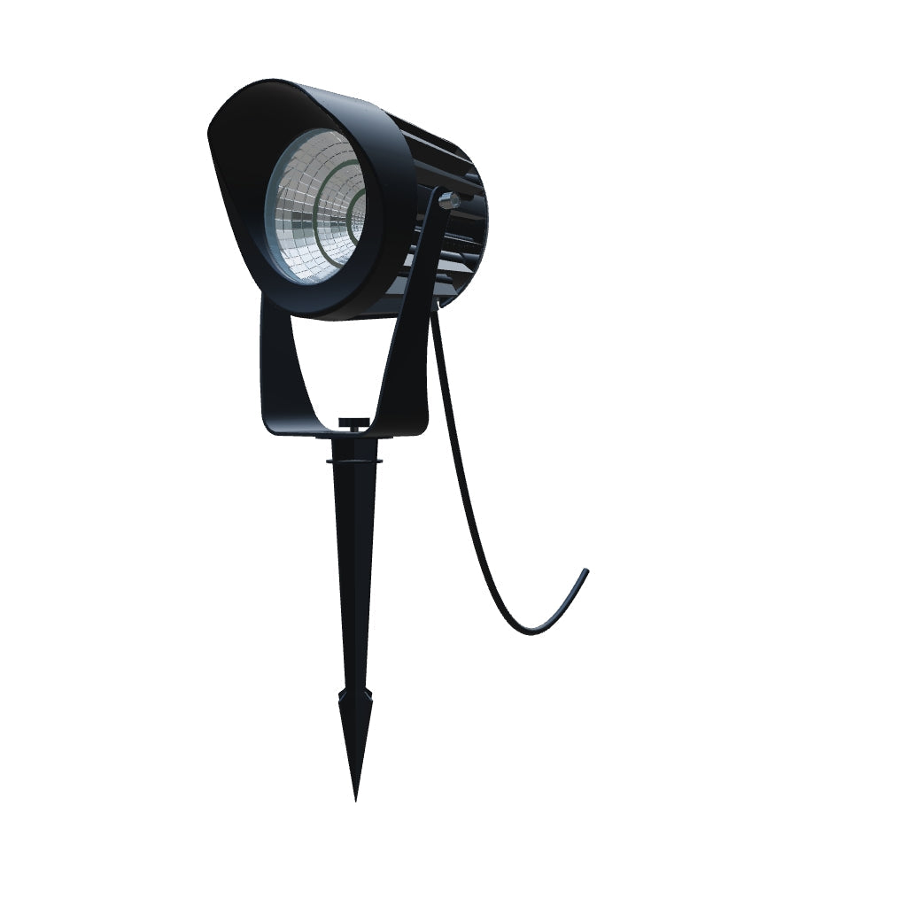 Foco LED de alto rendimiento para exteriores sobre una pica de suelo. Se suministra con un cable sin enchufe en el extremo.