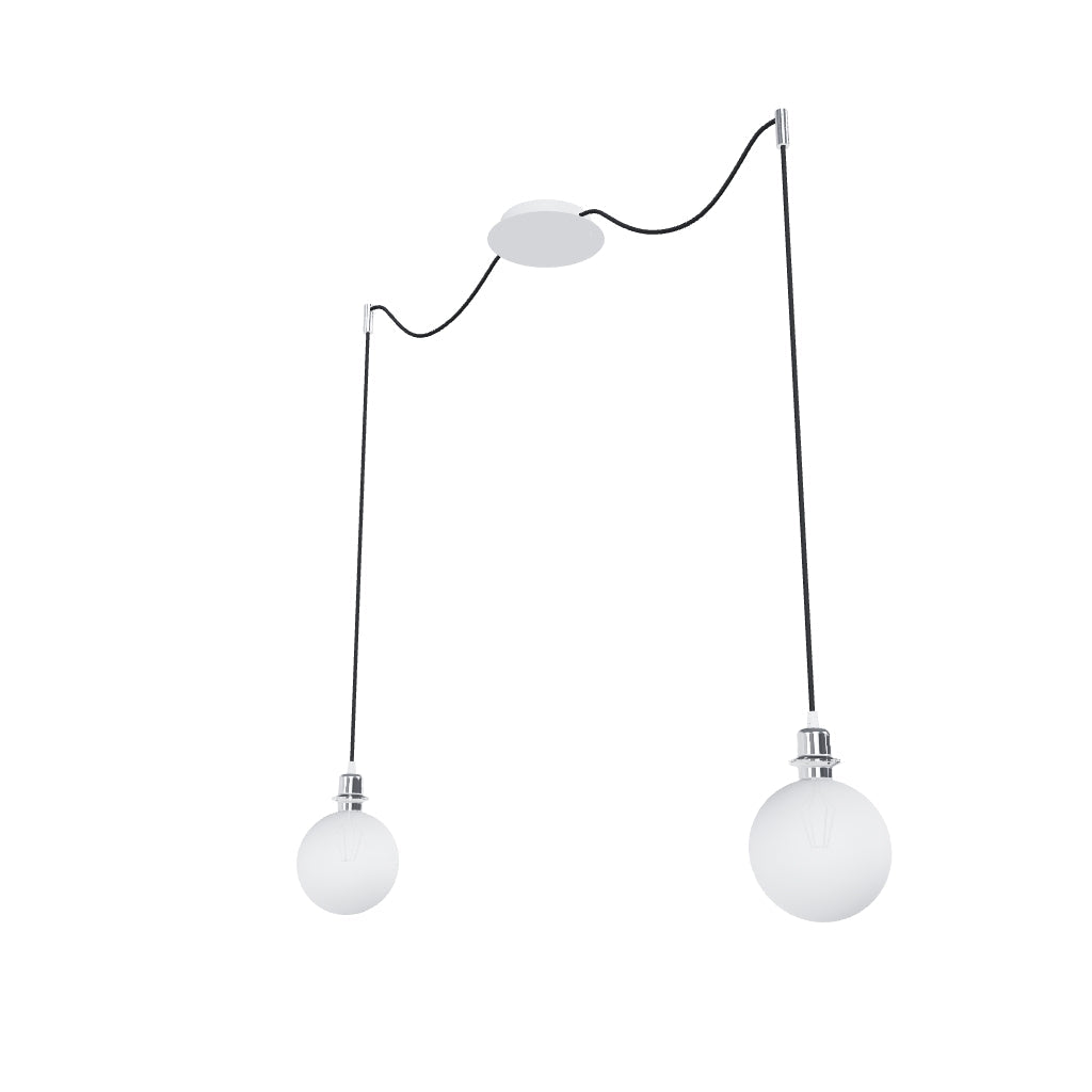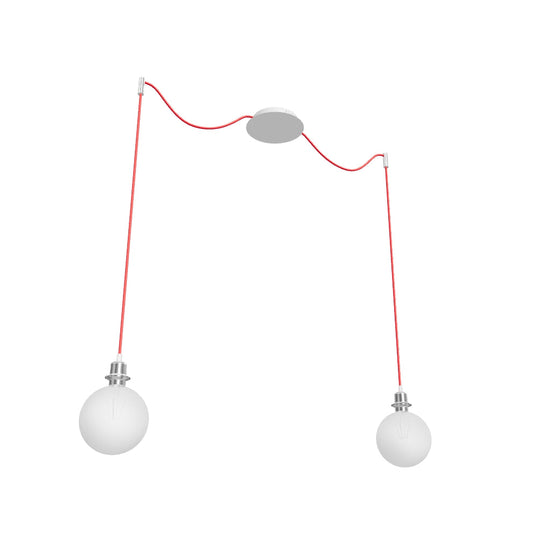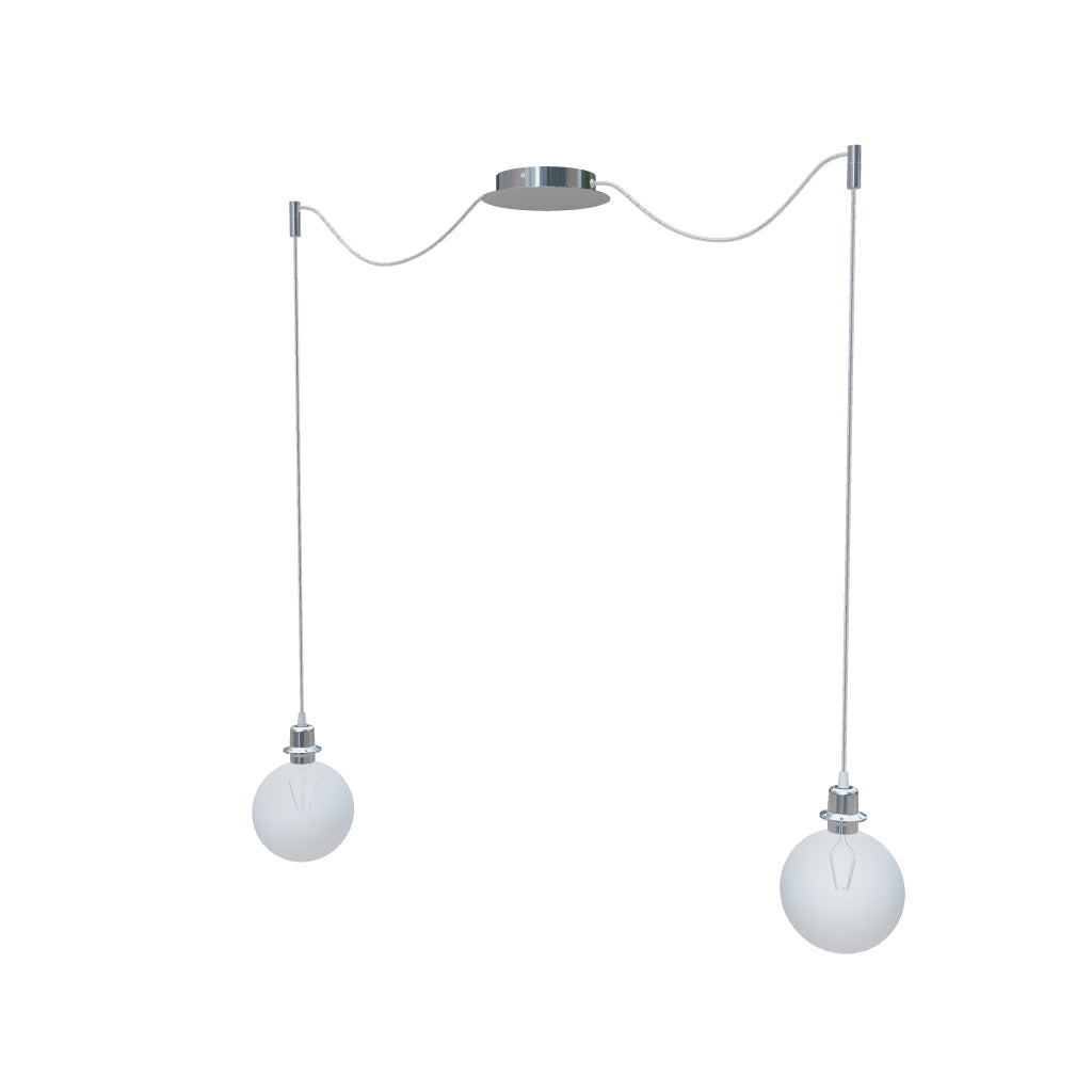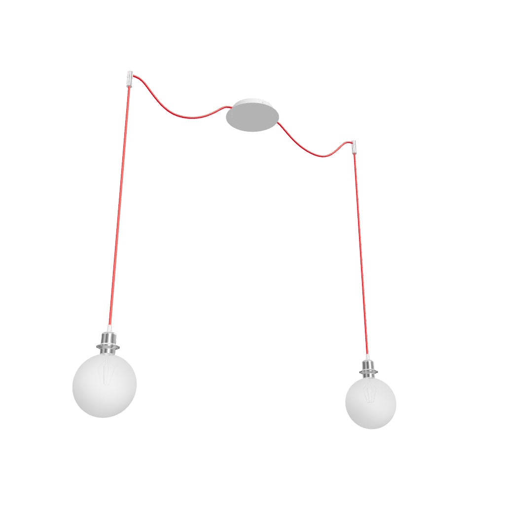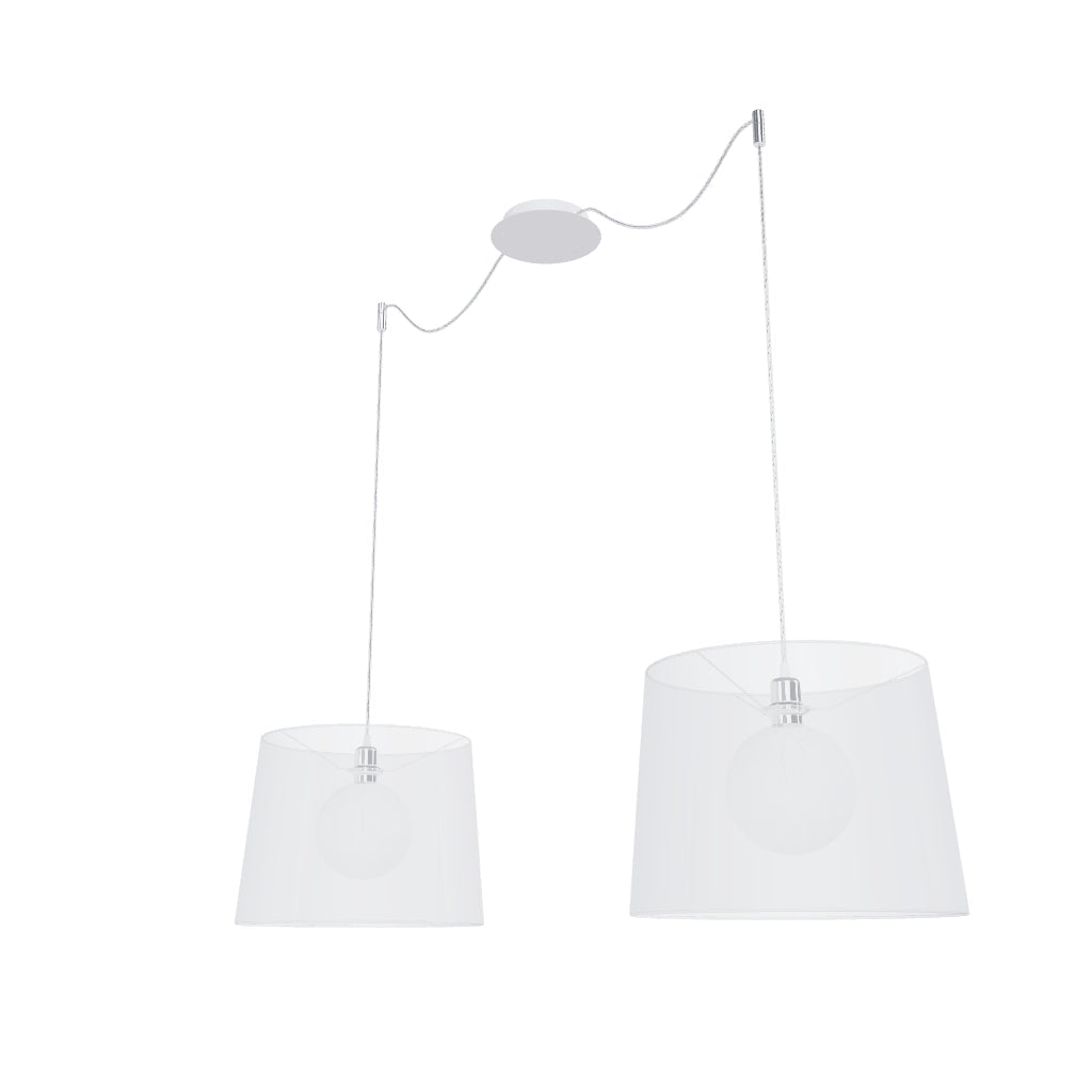 Luminaria colgante con base de techo central y dos cuerdas textiles individuales con base de metal E27. Las cuerdas de suspensión están equipadas con agarres de techo de cromo, que se pueden colocar a cualquier distancia desde la base a la longitud de la cuerda de 3 m. Adecuado para pantallas: ARISTA, DELI, JAKARANDA, DOUBLE 40/30, DOUBLE 55/30, ASPRO 40/30, ASPRO 55/30, RON 15/20, RON 40/25, RON 55/30, 30, TEMPO 30/19.