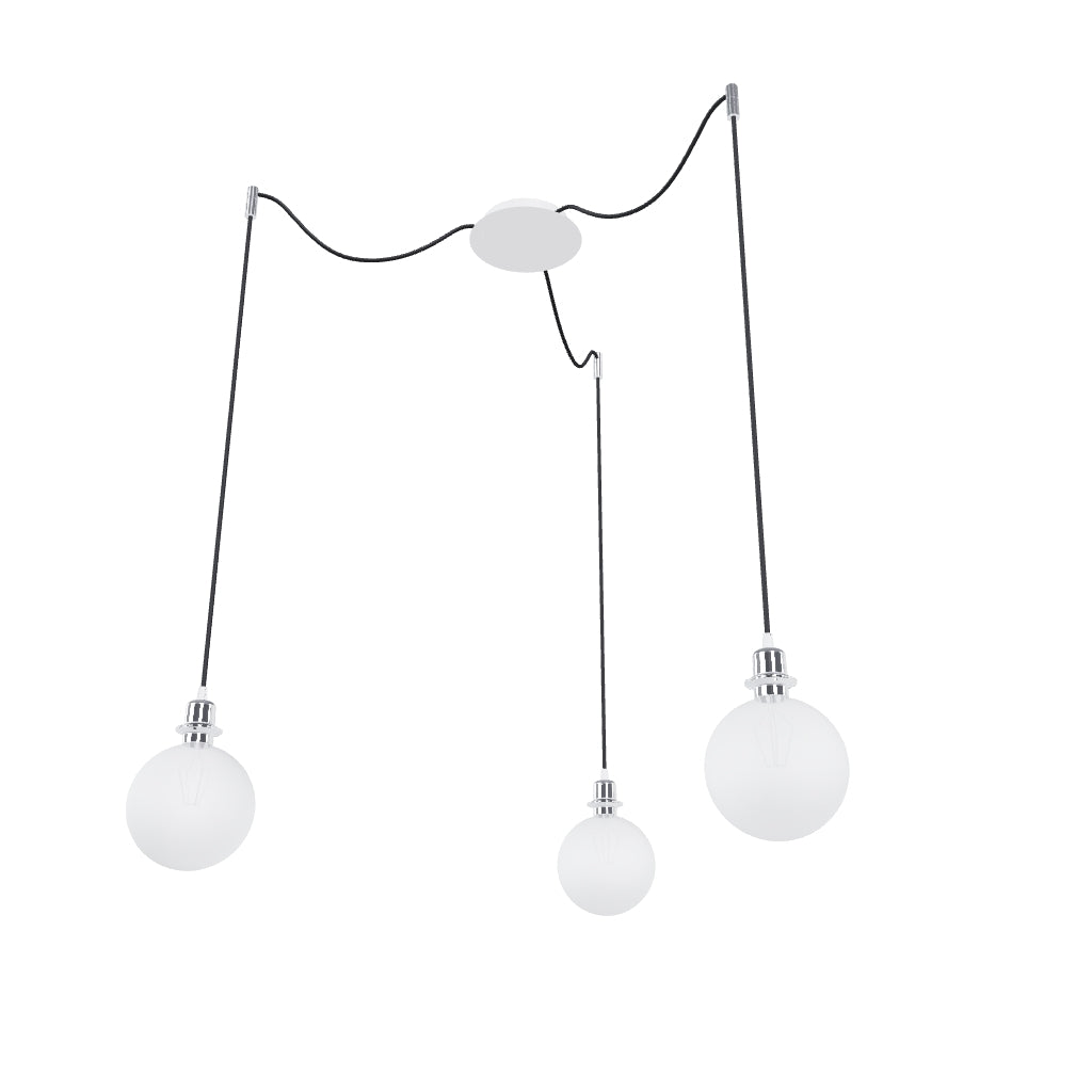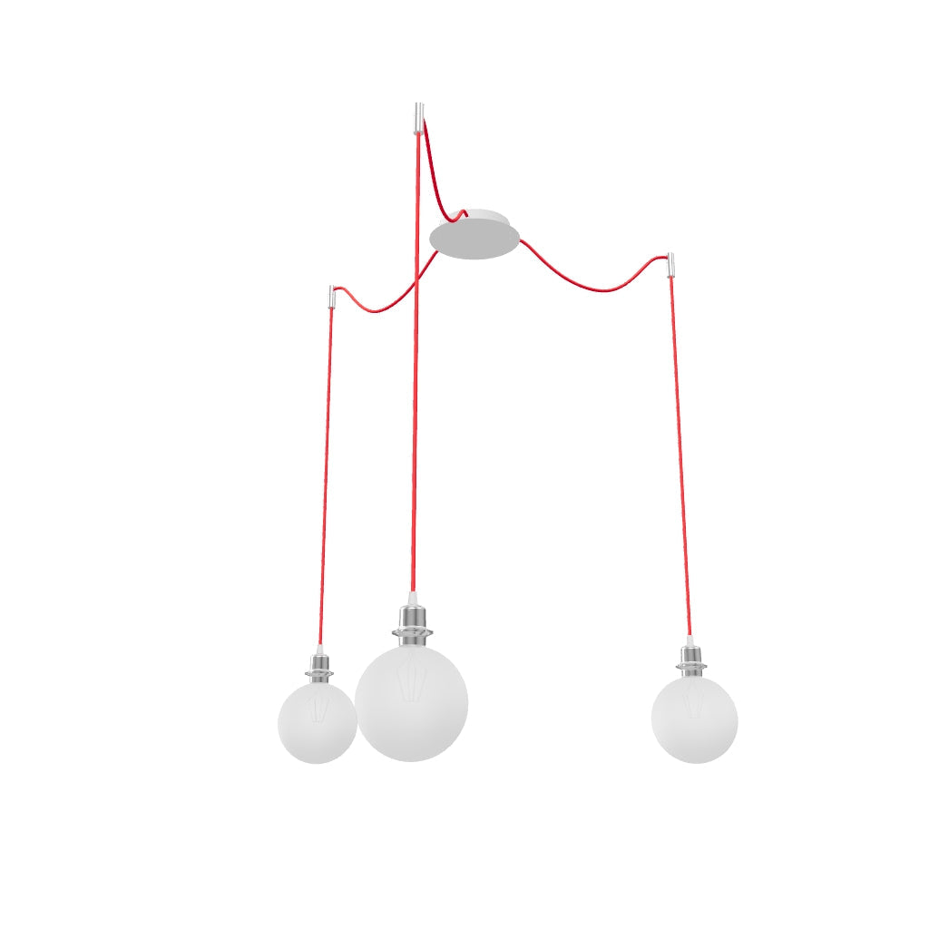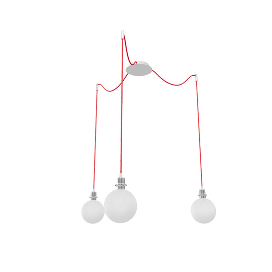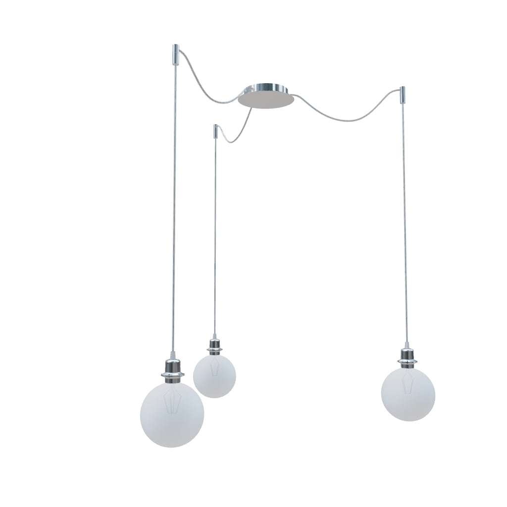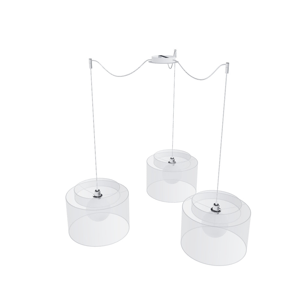 Luminaria colgante con base de techo central y tres cuerdas textiles individuales con base de metal E27. Las cuerdas de suspensión están equipadas con agarres de techo de cromo, que se pueden colocar a cualquier distancia desde la base a la longitud de la cuerda de 3 m. Adecuado para pantallas: ARISTA, DELI, JAKARANDA, DOUBLE 40/30, DOUBLE 55/30, ASPRO 40/30, ASPRO 55/30, RON 15/20, RON 40/25, RON 55/30, 30, TEMPO 30/19.