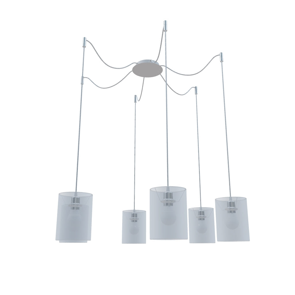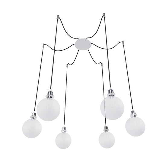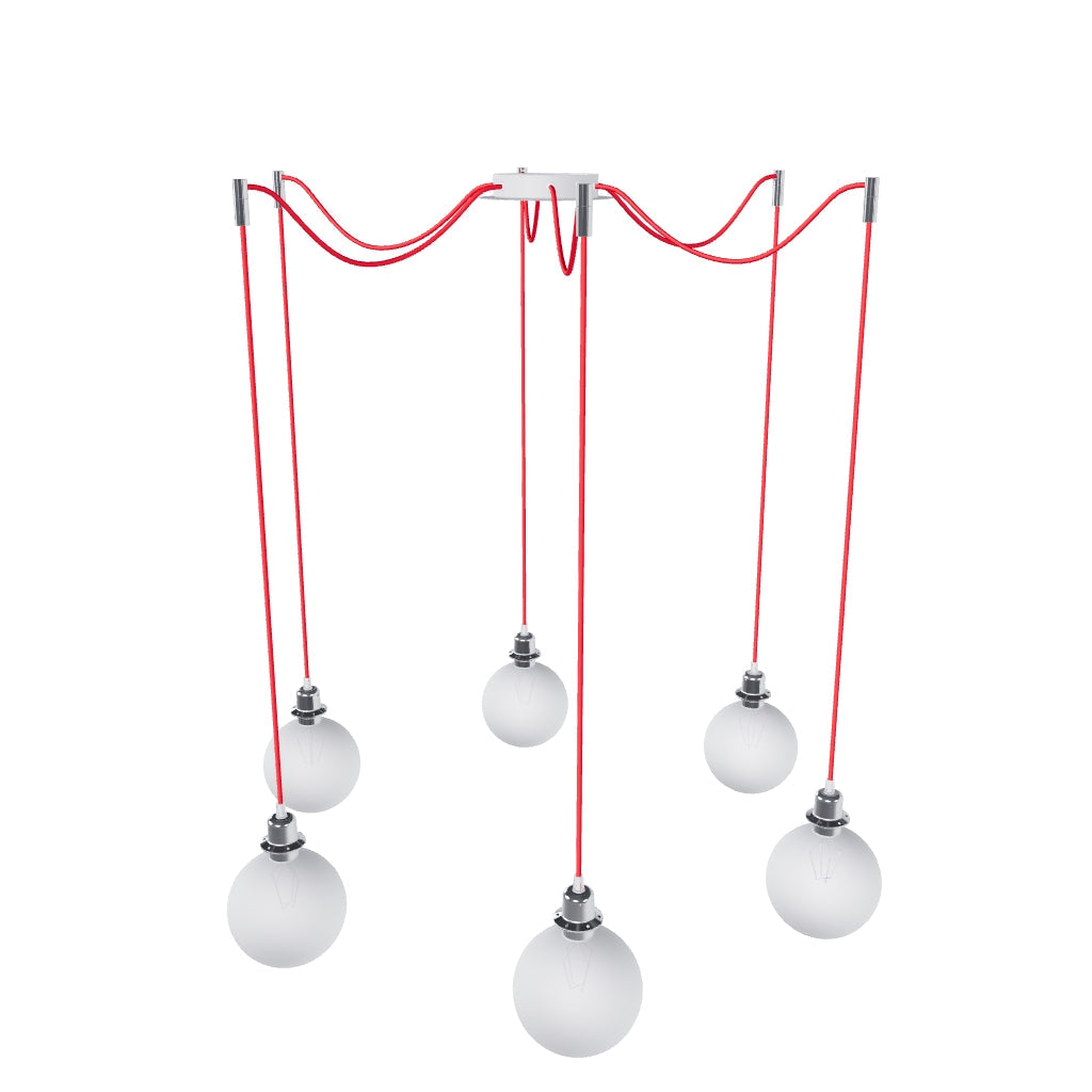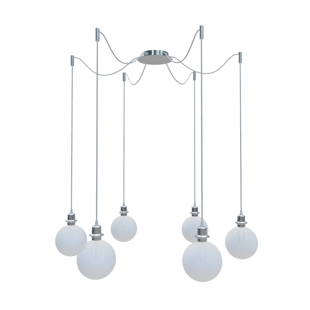 Luminaria colgante con una base de techo central y seis cuerdas textiles individuales con base de metal E27, para usar con lámparas decorativas o pantallas textiles adecuadas. Las cuerdas de suspensión están equipadas con agarraderas de techo de cromo, que se pueden colocar a una distancia individual de la base. Longitud total de la cuerda 3 m.