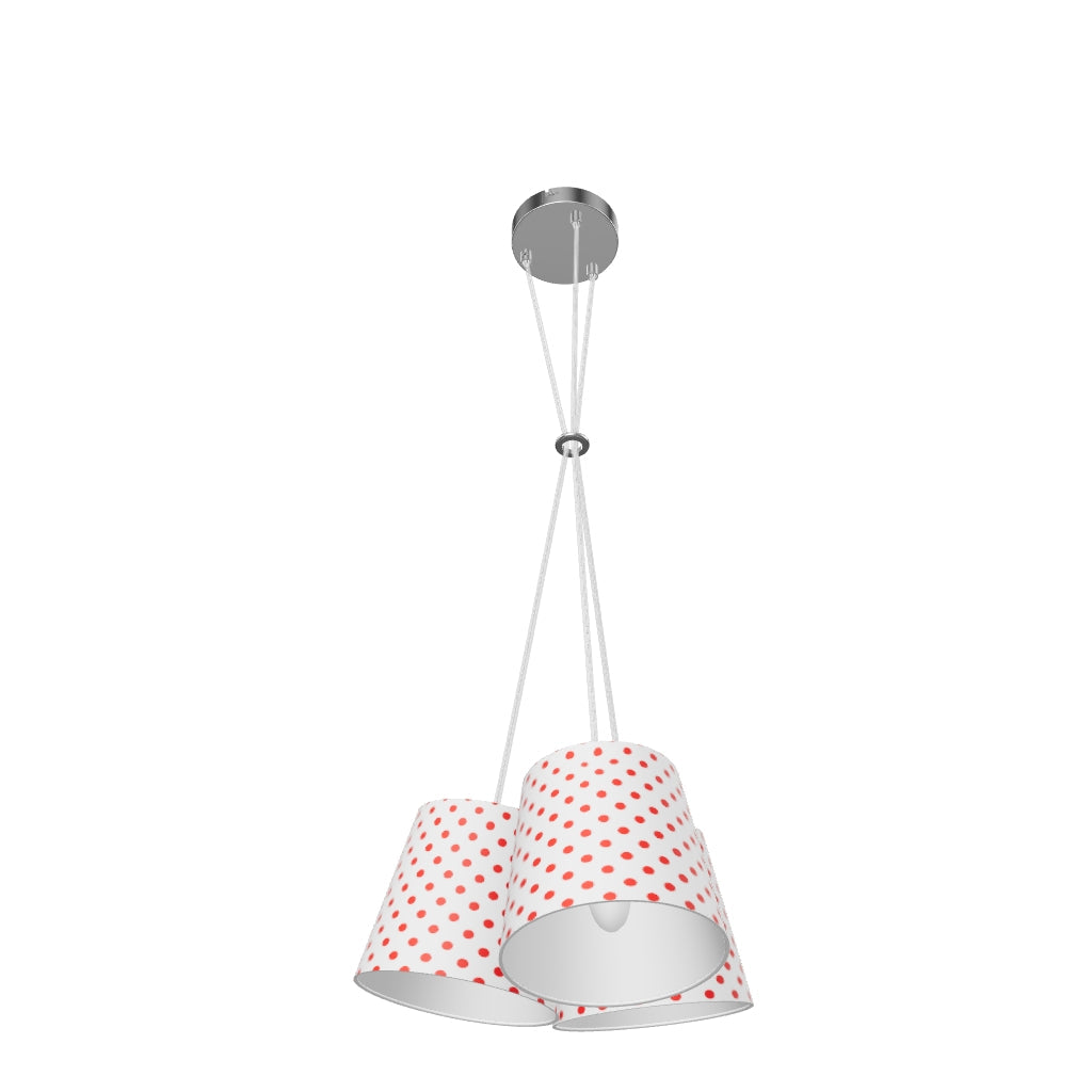 Lámpara colgante con una base y tres pantallas textiles, para tres fuentes de luz E14.